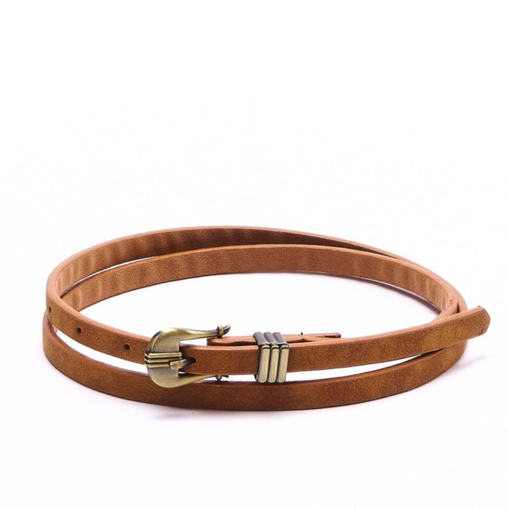 Женский ремень из экокожи от бельгийского бренда Jane's Story. Ремень с металлической пряжкой станет оригинальным акцентом вашего образа. Размер ремня (с пряжкой) - 102*1 см.