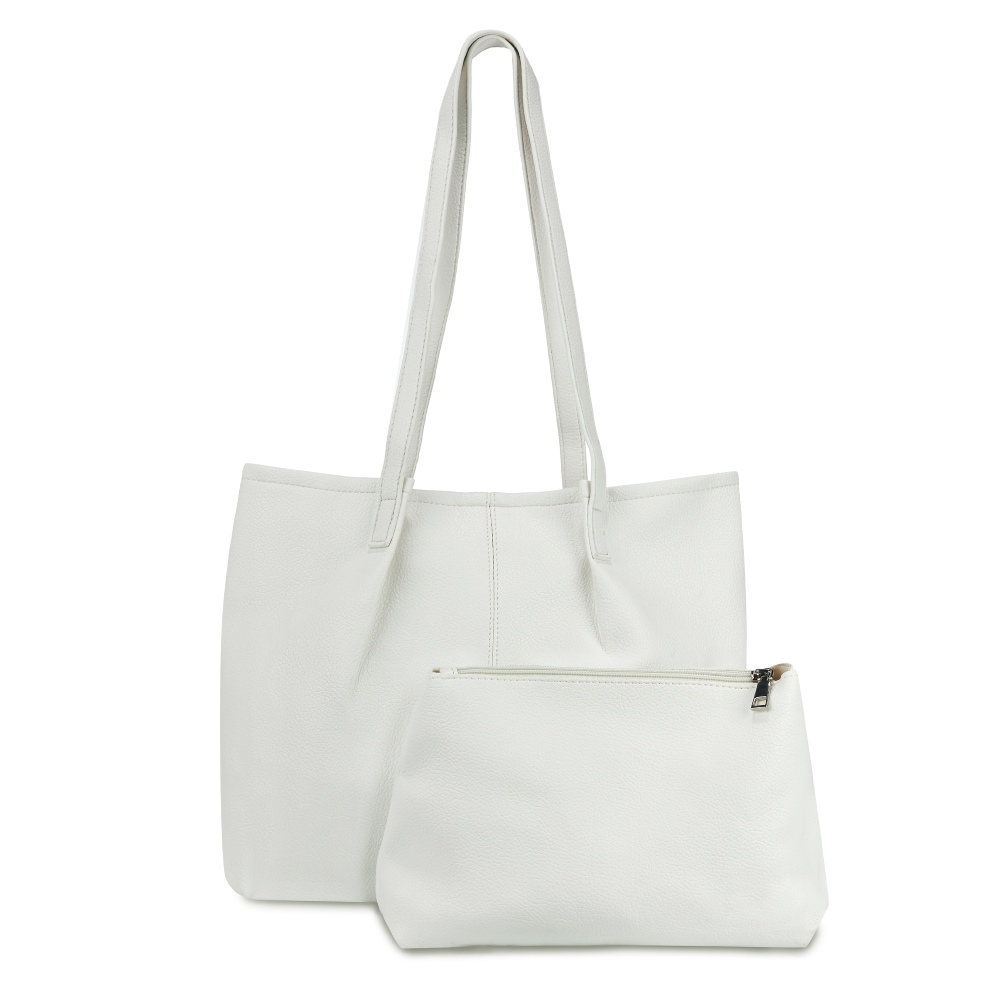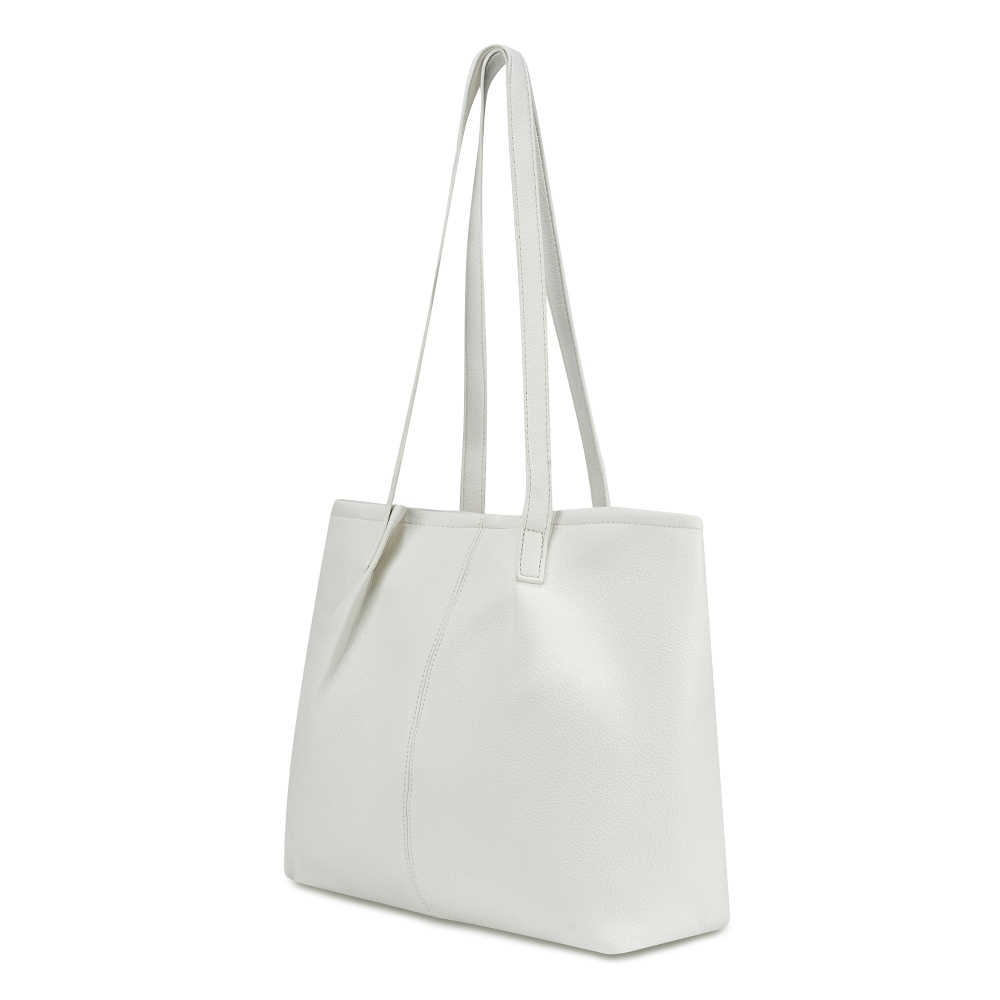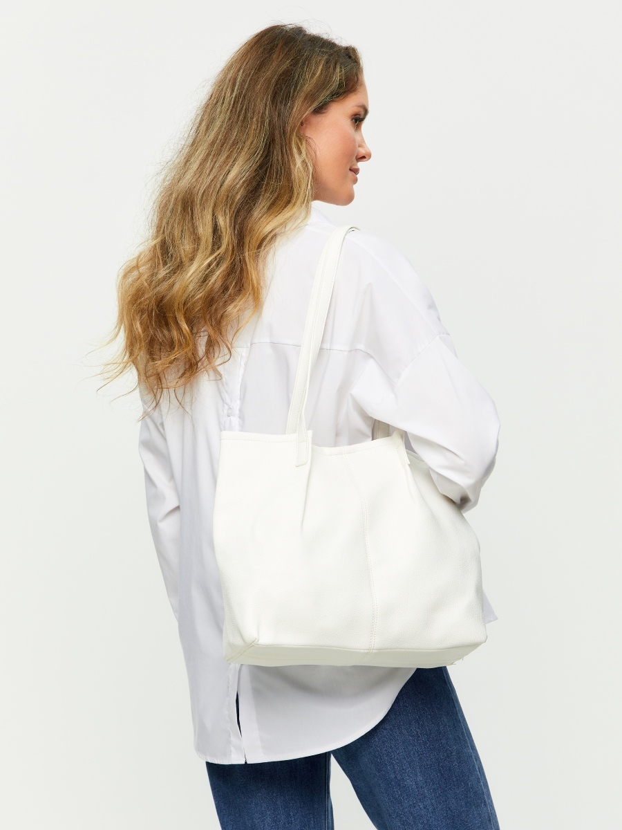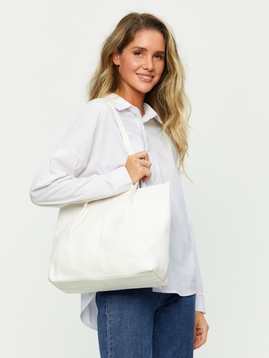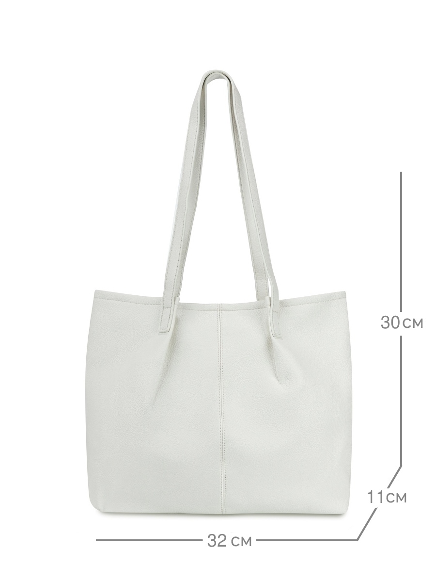 Женская сумка-шоппер выполнена из высококачественной зернистой экокожи, которая имеет невероятно приятную на ощупь фактуру. Сумка большая и вместительная, габариты изделия - (ШхВхГ) 30х32х11 см. Сумочка вмещает папки и документы формата А4. Удобная, легкая, стильная - такая сумка без труда дополнит любой образ. Внутри сумки на плечо находится одно основное отделение, которое закрывается на магнитную кнопку. В комплект входит съемная текстильная косметичка на молнии. Фурнитура сумки с двумя ручками выполнена в серебристом цвете.