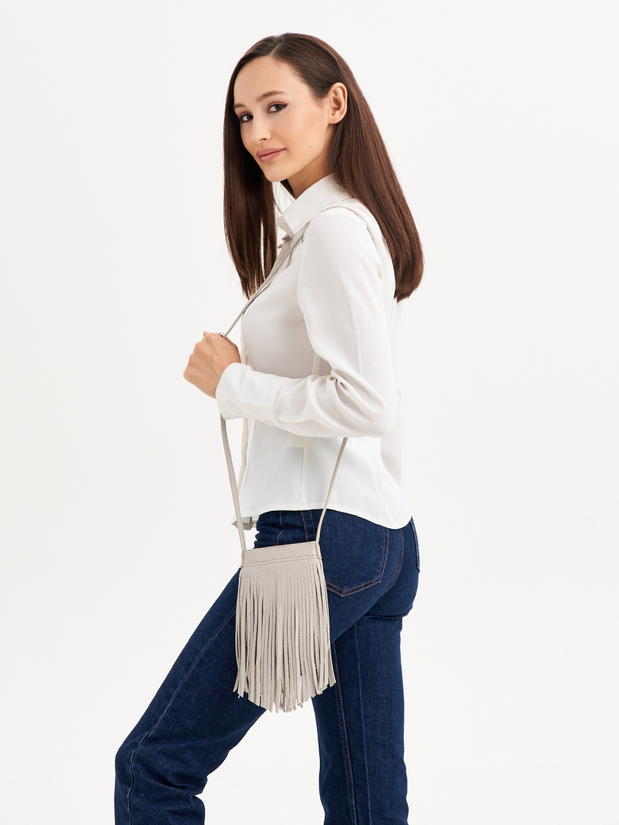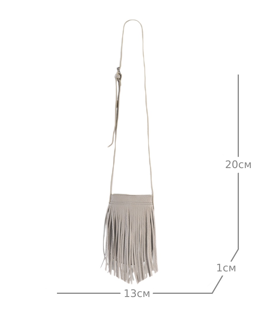 Женская сумка кроссбоди с бахромой из искусственной кожи с зернистой фактурой. Сумочка компактная (ВхШхГ 20х13х1) имеет 1 отделение без подклада на магните. Сумка мини для телефона, уместит ключи и другие мелочи, необходимые на прогулке. Плечевой ремень регулируется до 120 см. Фурнитура выполнена из металла в серебристом цвете. Сумка с застежкой поставляется в текстильной (пыльник) и полиэтиленовой упаковке, что защищает ее от повреждений, а также позволяет удобно хранить женскую сумочку в дальнейшем использовании.