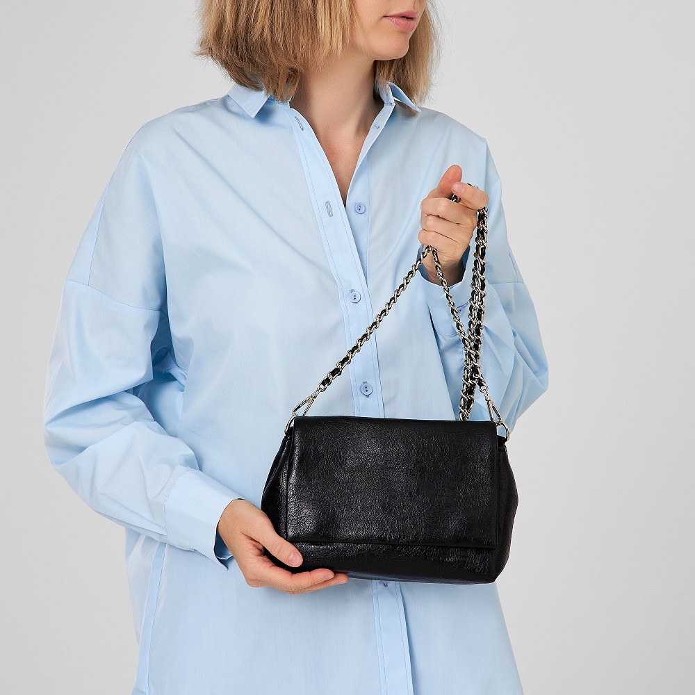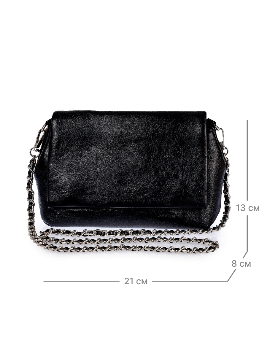 Миниатюрная женская сумка кросс-боди выполнена из гладкой экокожи, которая имеет невероятно легкий вес и приятную на ощупь фактуру. Габариты (ВхШхГ) 13х21х8 см. Основное отделение под клапаном на магнитах на текстильном подкладе. Внутри один кармашек на молнии. Плечевой нерегулируемый ремень-цепочка длиной 112 см, позволят носить сумку в руке, на плечо и через плечо как кроссбоди. Фурнитура выполнена из металла в серебристом цвете. Сумка с ручкой поставляется в текстильной (пыльник) и полиэтиленовой упаковке, что защищает ее от повреждений, а также позволяет удобно хранить женскую сумочку в дальнейшем использовании.