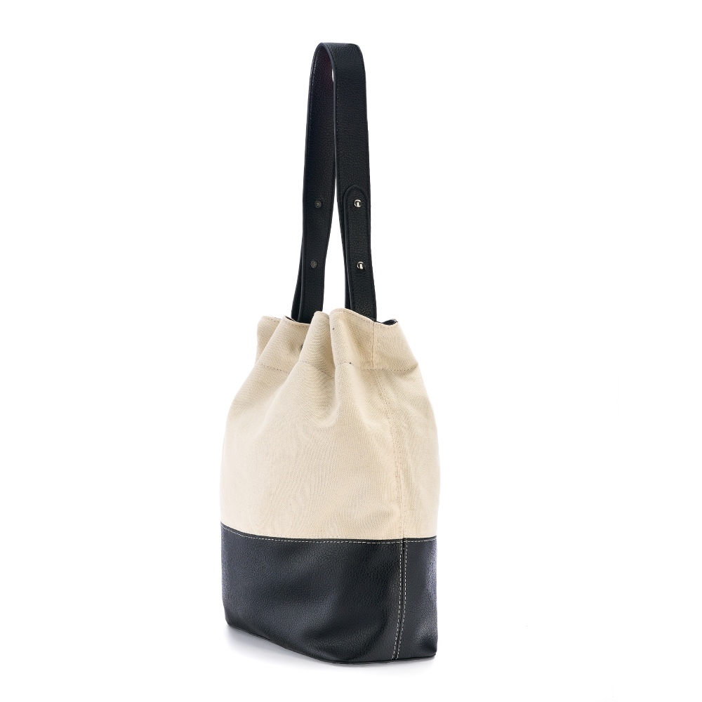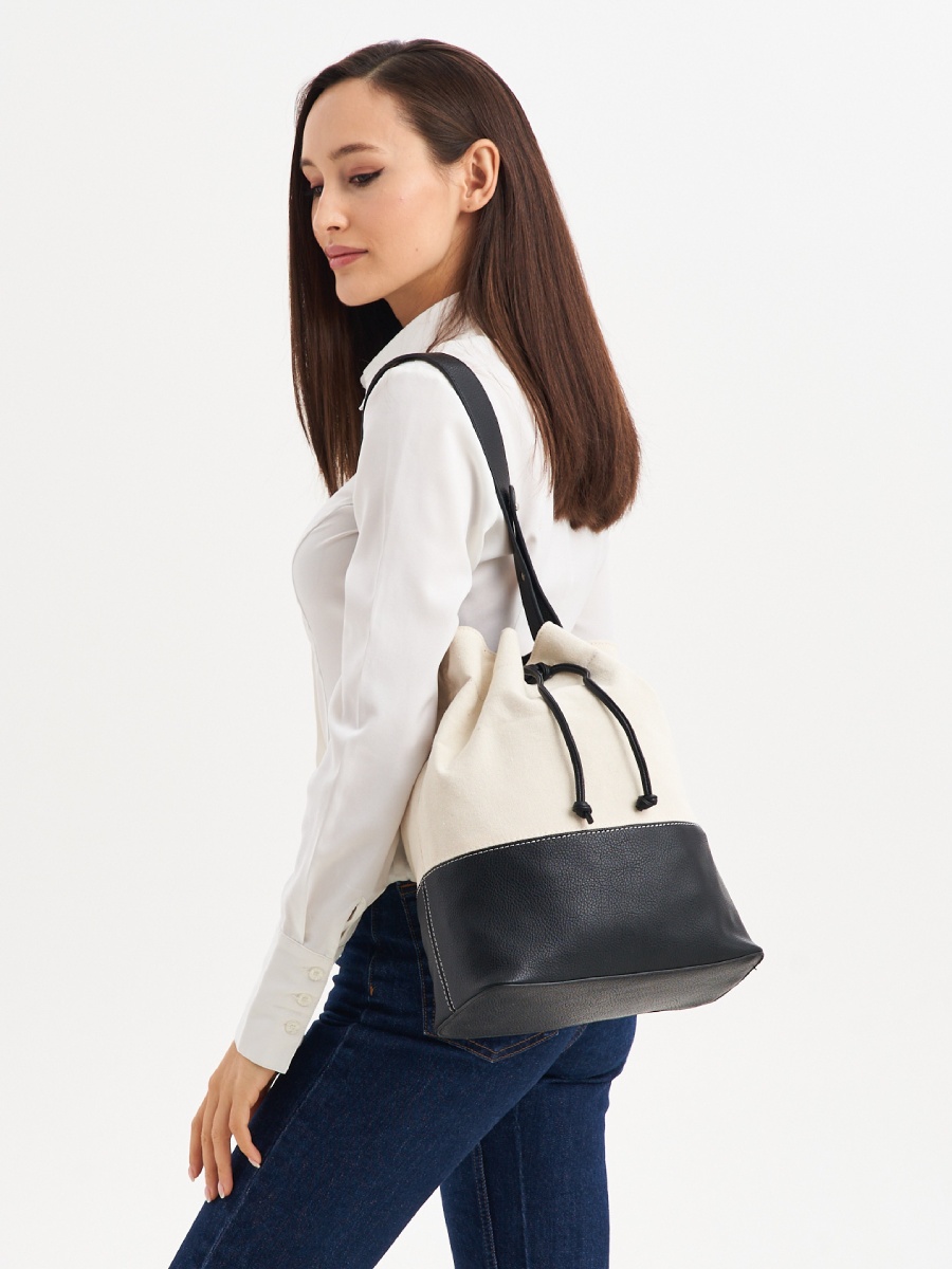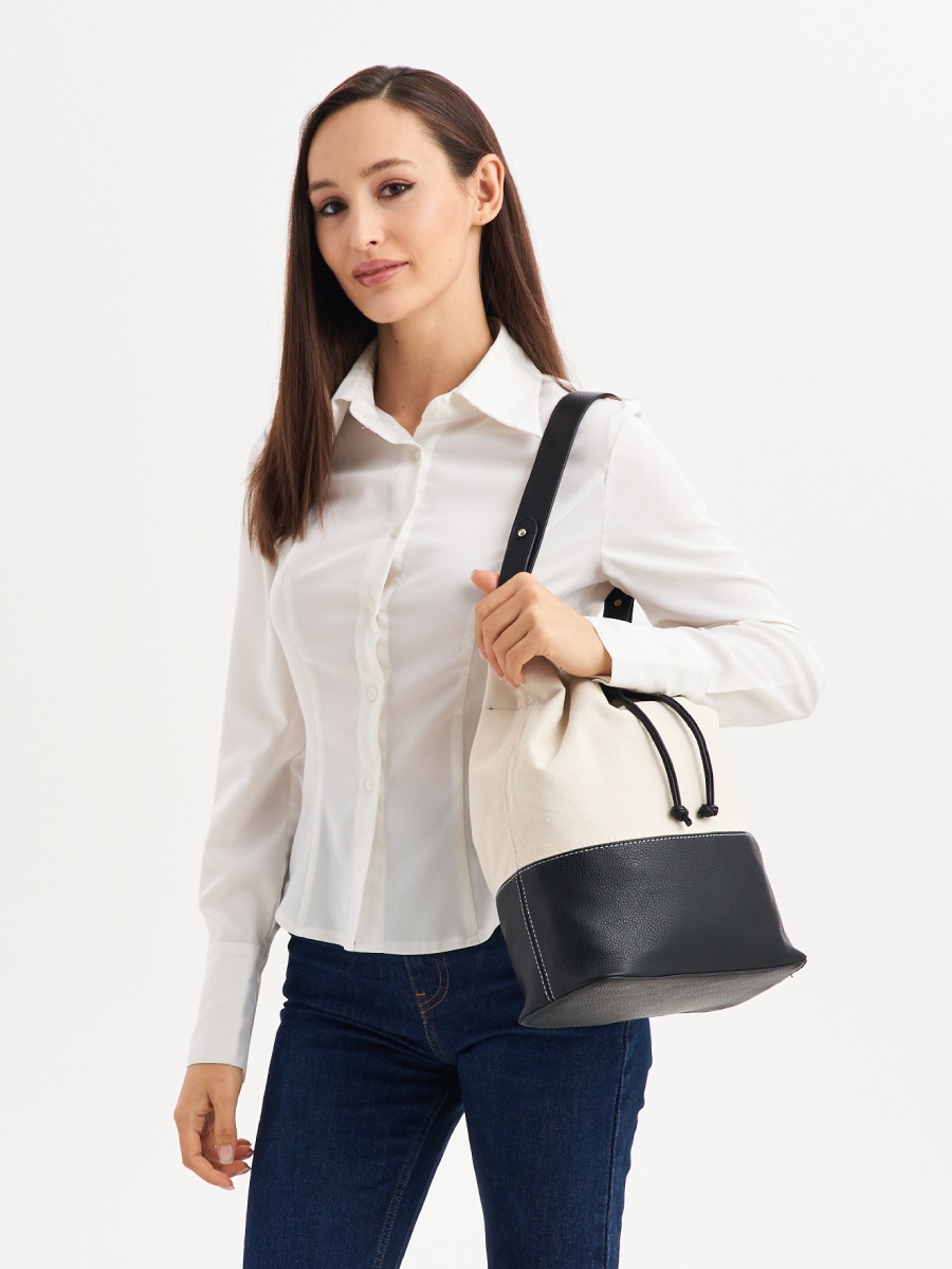 Женская сумка формы мешок выполнена из полиэстера с вставками из экокожи, которая имеет приятную на ощупь натуральную фактуру джинсы. Габариты сумочки - (ВхШхГ) 34х27х12 см., подходит для документов формат А4. Основное отделение на подкладе из плотного полиэстера затягивается на шнур из экокожи. Уплотненное дно позволяет сумке шоппер сохранять форму и устойчивость. Внутри один карман на молнии. В комплекте плечевой ремень, регулируется по длине до 65 см., поэтому сумку можно носить в руке или на плечо как кроссбоди. Фурнитура выполнена из металла в серебристом цвете. Сумка торба поставляется в текстильной (пыльник) и полиэтиленовой упаковке, что защищает ее от повреждений, а также позволяет удобно хранить женскую сумочку в дальнейшем использовании.