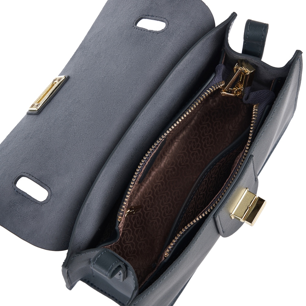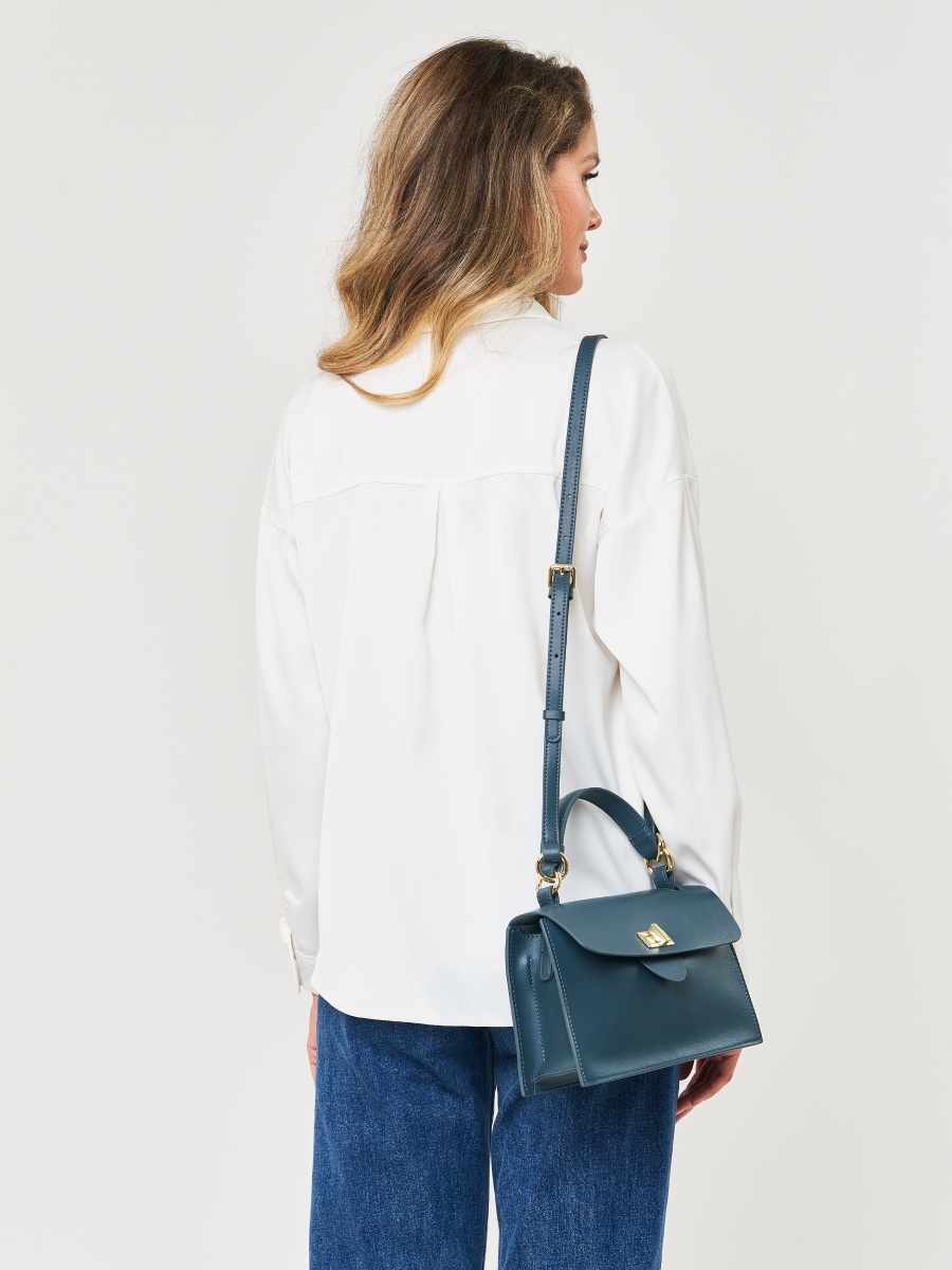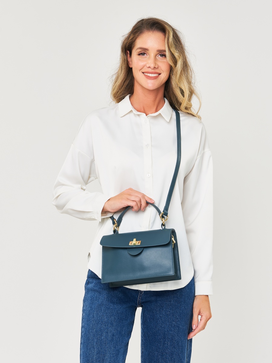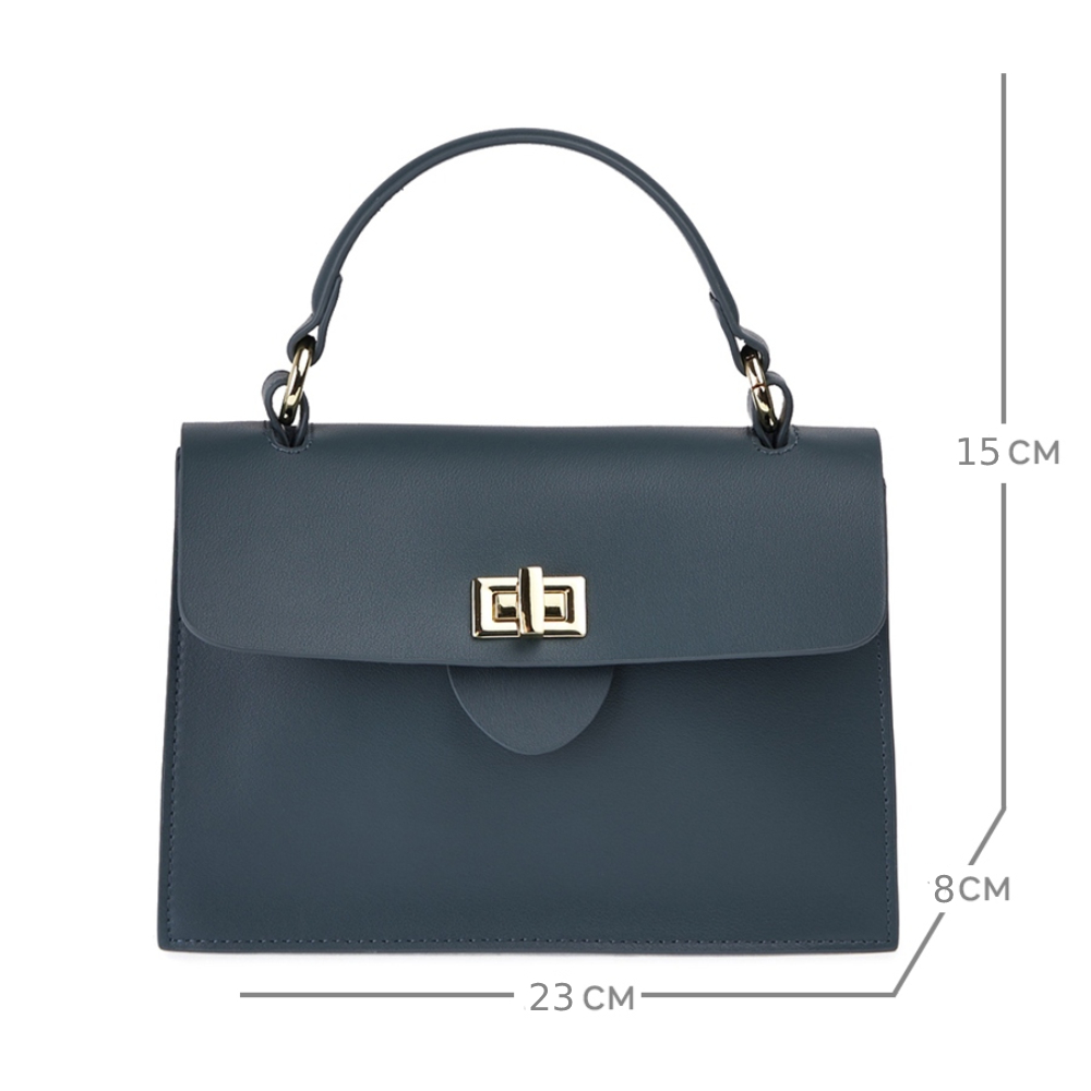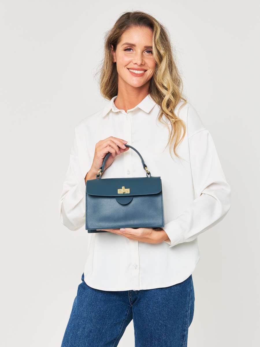 Женская сумка-сэтчел из натуральной кожи. Габариты - 23х15х8 см. Сумка закрывается на клапан с поворотным замком. Внутри 3 вместительных отделения, одно из которых закрывается на молнию, 1 открытый карман и карман на молнии. Дополнительный открытый карман на внешней задней стенке. Съемная ручка и длинный плечевой ремень (115 см.) фиксируются на металлических кольцах. Фурнитура выполнена в золотистом цвете. Сумка поставляется в текстильной и полиэтиленовой упаковке.