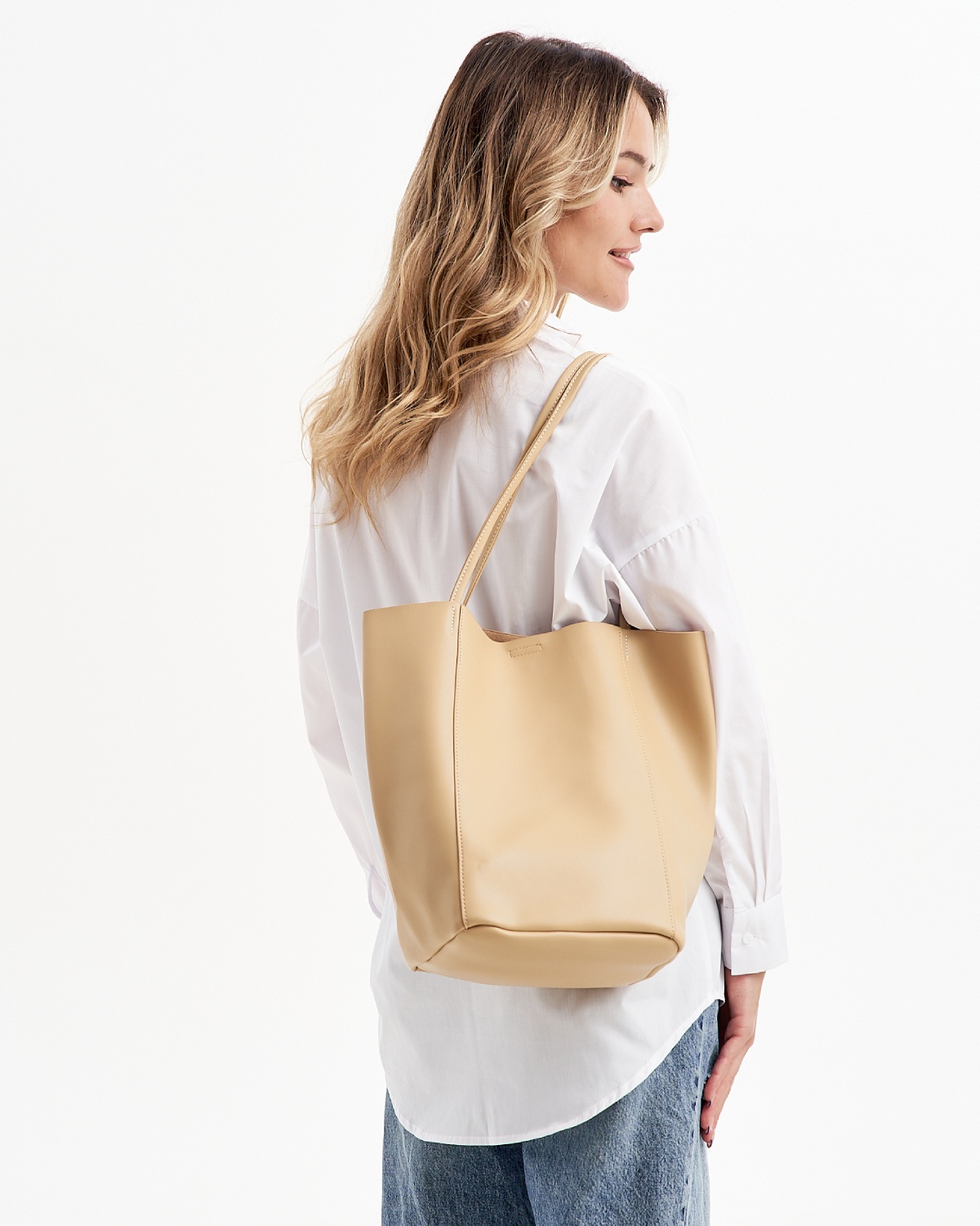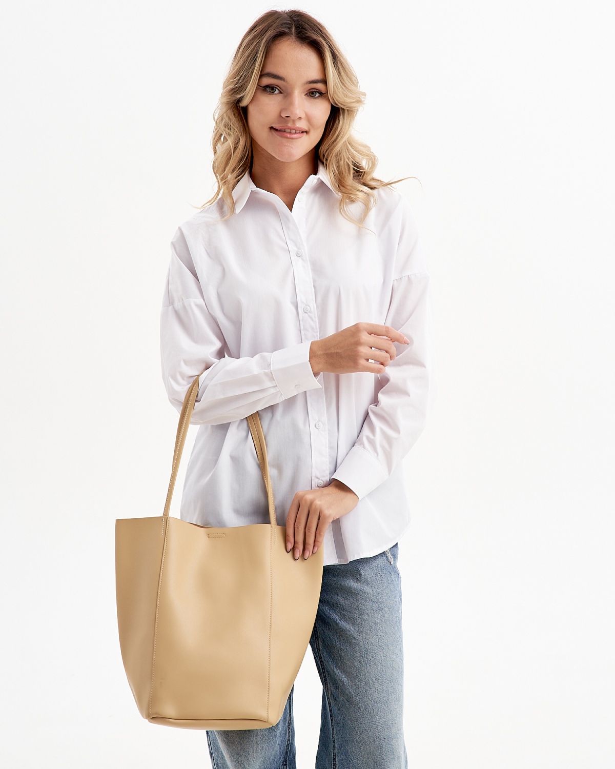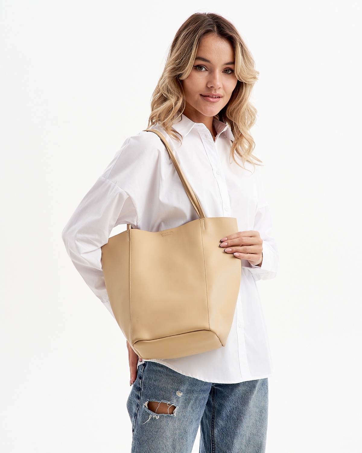Женская сумка на плечо выполнена из качественной гладкой экокожи, невероятно мягкой и приятной фактуры. Габариты шоппера по дну изделия (ВхШхГ) 31х20х19см. позволяют разместить документы А4 и ноутбук. Внутри сумочки находится одно большое основное отделение без подклада, которое закрывается на магнит. В комплект входит косметичка из искусственной кожи на молнии, размером 17х17х11 см. Высота ручек составляет 24 см. Уплотненное дно позволяет сумке-шоппер лучше сохранять форму и устойчивость. Фурнитура выполнена из металла в серебристом цвете. Сумка с застежкой поставляется в текстильной (пыльник) и полиэтиленовой упаковке, что защищает ее от повреждений, а также позволяет удобно хранить женскую сумочку в дальнейшем использовании.