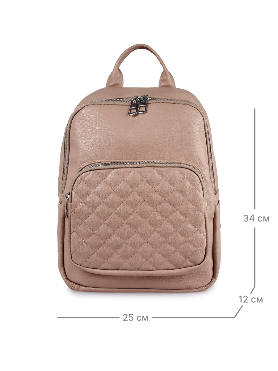 Женский городской рюкзак выполнен из искусственной кожи с зернистой фактурой. Рюкзак среднего размера, габариты модели (ВхШхГ) 34х25х12 см. Легкая, компактная и вместительная модель – такой универсальный рюкзачок дополнит любой образ. Основное отделение закрывается на молнию, внутри два открытых кармана и карман на молнии. На лицевой стороне один большой карман на молнии. По бокам два открытых кармана. Фурнитура выполнена из металла в серебристом цвете. Отличный вариант как для прогулок, так и для путешествий. Поставляется в текстильной (пыльник) и полиэтиленовой упаковке, что защищает от повреждений, а также позволяет удобно хранить в дальнейшем использовании.