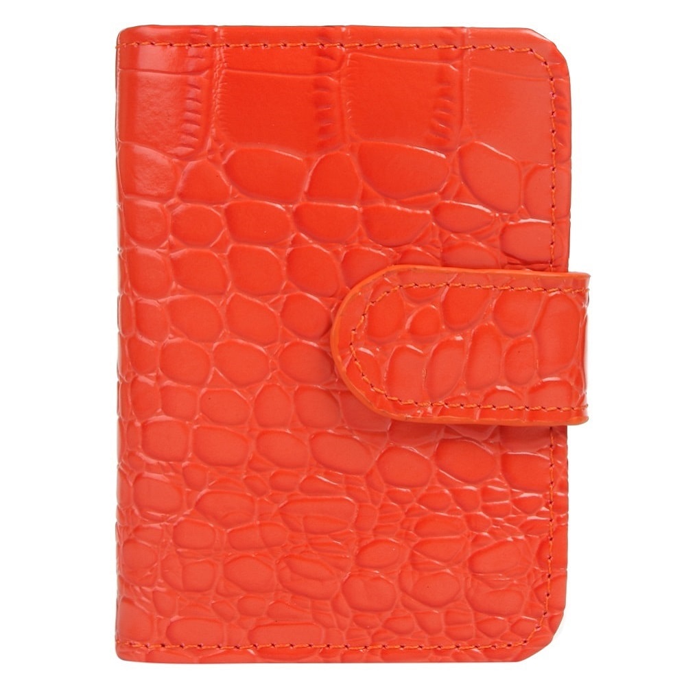 Оригинальная визитница из натуральной кожи с тиснением под кожу крокодила (снаружи) и натуральной зернистой кожи (внутри) . Для удобства, на визитнице две кнопки, которые позволят увеличить объем визитных карт. Модель продается в эффектной подарочной картонной коробке.